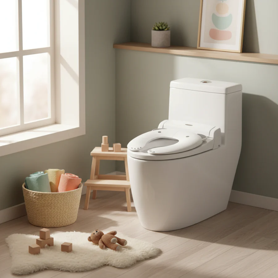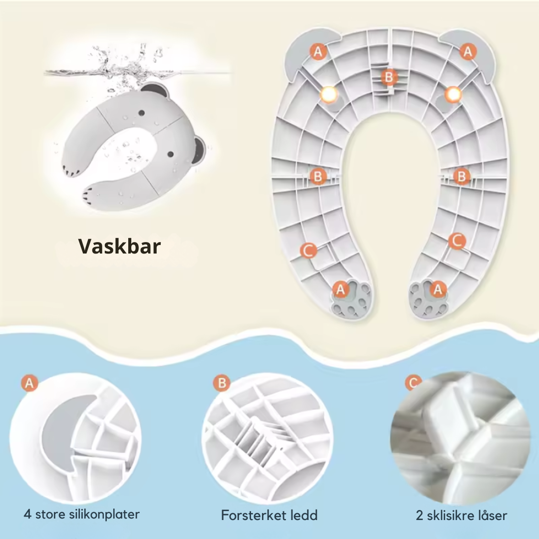 Setet foldes enkelt ut og plasseres på en vanlig toalett. De sklisikre kantene og den stabile utformingen gjør at det ligger trygt på plass, slik at barnet kan føle seg trygt og komfortabelt under toalettbesøket. Passer de fleste standardtoaletter både hjemme og på reisen.